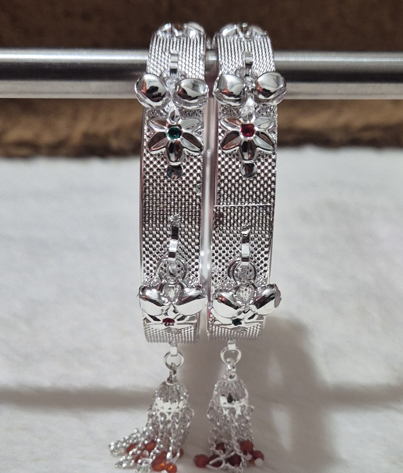 सिल्वर कलर मे झुमर ओर लटकनं के साथ